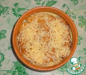 Залить блинные рулетики и посыпать тертым сыром. Поставить в духовку и запекать 15-20 минут при 180 градусах.