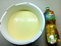 Молоко взбить с яйцами и сахаром. Постепенно добавить просеянную муку и подсолнечное масло. |