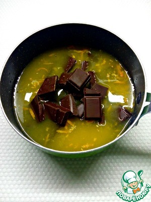 Цедру и сок налить в сотейник или кастрюльку, добавить шоколад.