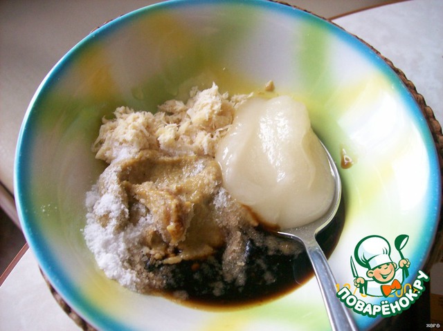 Смешиваем горцицу, тертый хрен, мед, соевый соус, соль (при необходимости) и специи. Если слишком густо - разбавьте небольшим количеством сметаны или даже водой.