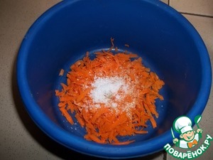Часть начинки лучше приготовить заранее. Грибы отварить (у меня замороженные шампиньоны). Морковь натереть на терке, добавить сахар и 1/3 ч. л. соли, слегка помять рукой.