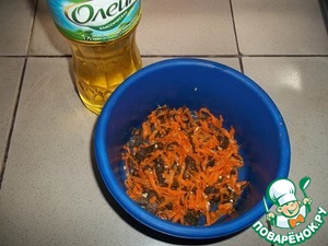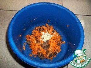 Растительное масло раскалить на сковороде и вылить на чеснок, перемешать. Убрать на холод хотя бы на час. Я оставила на ночь. Получается морковь с грибами по-корейски.