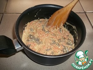 Соус будет очень густой, так и должно быть, блинчики будут хорошо держать форму после охлаждения. Добавить в соус морковь с грибами, перемешать. Начинка готова.