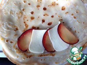Сыр и сливы нарезать пластинками тонко. Блин смазать подготовленным медовым соусом и на край блина выложить поочередно моцареллу и сливы. Закрыть вторым краем блин.