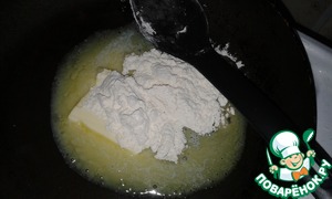 Для приготовления соуса растопить сливочное масло, всыпать муку и обжарить ее до золотистого цвета