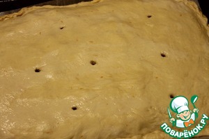 Также раскатать оставшуюся часть теста, накрыть ею начинку, защипать края. Сверху сделать ножом 5 отверстий, для выхода пара. Верх пирога смазать молоком и поставить в заранее разогретую до 200 градусов духовку на 40 минут. Приятного аппетита!