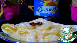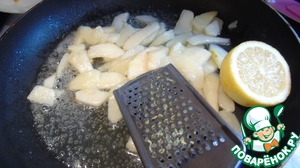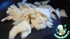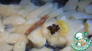 Груши очистите и нарежьте дольками, добавьте в сковороду