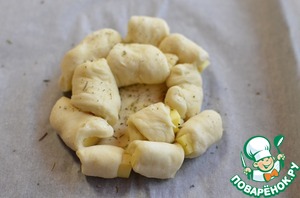 На край теста выкладываем кусочек сыра и заворачиваем его как на фото.