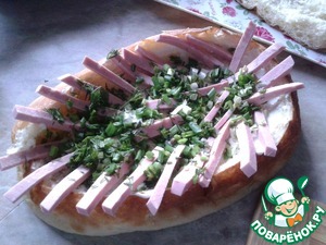 Из лаваша выбрать мякиш, дно намазать майонезом, выложить елочкой нарезанную брусочками колбасу. Присыпать рубленным укропом и зелёным луком.