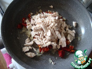 Грудку отварную режем мелко, отправляем в сковороду, солим и перчим по вкусу.