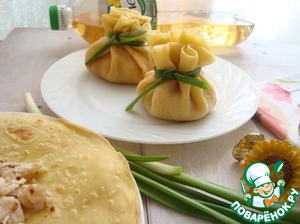 Заворачиваем начинку в блины. Я сформировала блинные мешочки и завязала их зелёным луком.