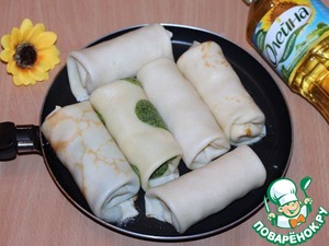 • 7. Выложить начинку на блинчики и свернуть их в виде конвертика.