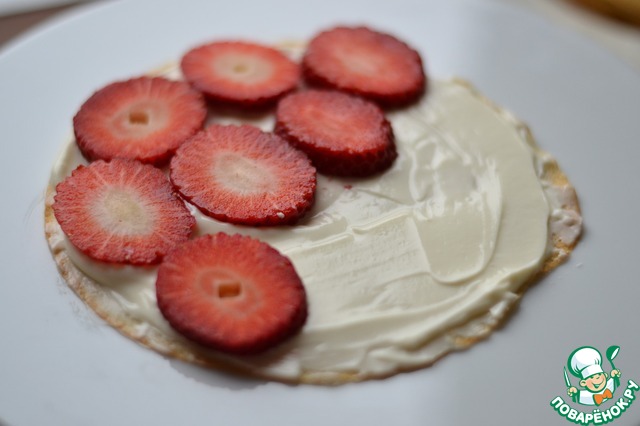 На блин нанесем творожную массу и выкладываем клубнику.