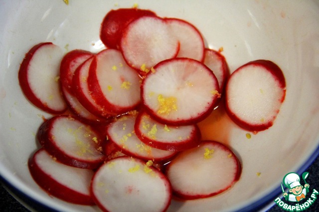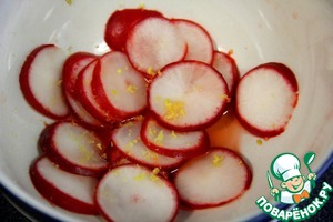 Режем редис и смешиваем с лимонным соком и лимонной цедрой.