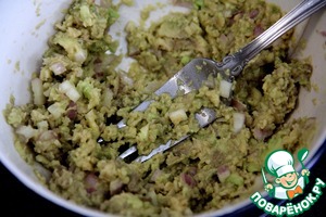 Для гуакамоле смешиваем авакадо, мелко нарезанный красный лук, пропущенный через чеснокодавилку чеснок, перец кайен, соль, лимонный сок и лимонную цедру.