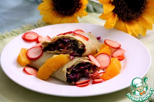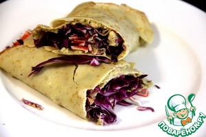 Горизонтальной линией по центру кладем крабовое мясо и мелко нарезанную краснокачанную капусту