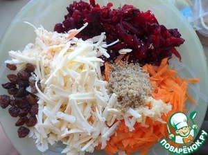 Натереть на терке вареную свеклу, свежую морковь, плавленый сырок, измельчить чеснок, добавить изюм и орехи. Перемешать.