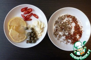 Нарежем чеснок, чили, лимон тонкими пластинками. Все специи истолчем в крупную крошку.
