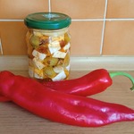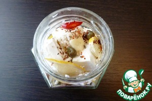 Укладываем брынзу в банку, пересыпая специями и кусочками чеснока, острого перца чили и лимона. Затем зальем оливковым маслом и добавим немного винного уксуса. Жидкость должна покрывать брынзу.