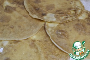 Выкладываем внахлест блины, по 4 на каждый рулет
