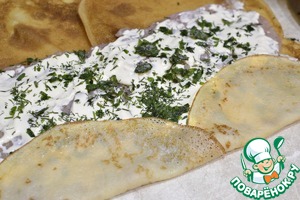 Посыпаем зеленью, сворачиваем рулетом