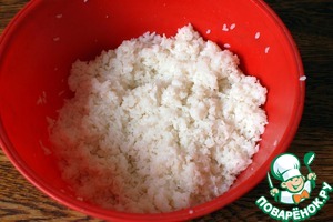 Для этого добавляю в рисовый уксус соль и сахар, нагреваю в микро 60 секунд и размешиваю до растворения. Выливаю заправку в рис (он еще теплый) и аккуратно перемешиваю.