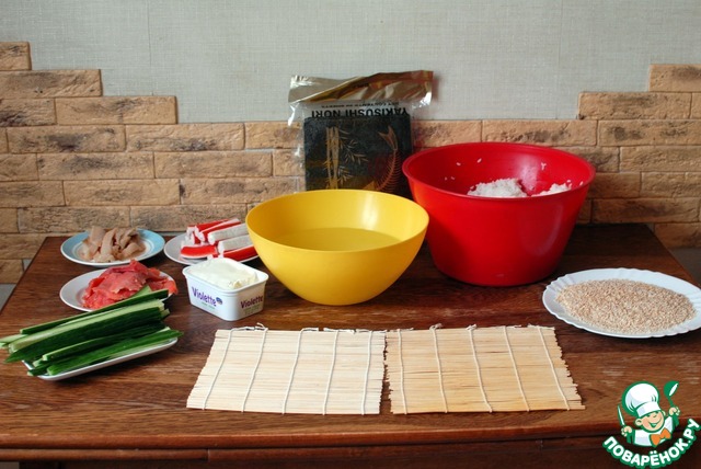 Нам нужны рис, миска с водой смачивать руки, бамбуковый коврик, нори, продукты для начинки.