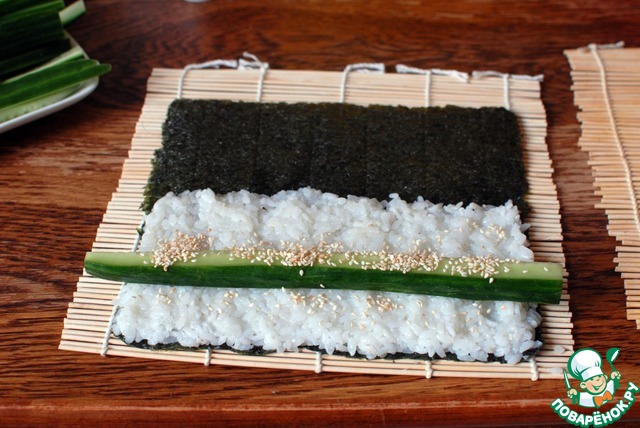 Хочу сказать, что роллы я делаю "по-русски", нормального размера))) Поэтому использую лист нори целиком и не жалею начинки.
