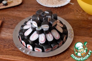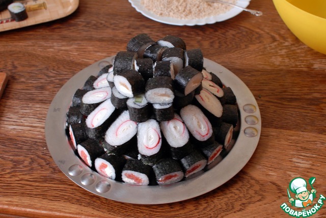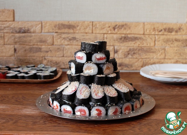 Предлагаю вам отличную идею для праздника, фуршета, семейного или дружеского застолья. Мой сын большой любитель роллов, и я долго думала, чем бы его удивить на день рождения и решила подать роллы в виде торта. Сюрприз удался на славу! Ребенок был в восторге, и гостям очень понравилось. А еще такое угощение получается довольно экономичным, что в наше время, согласитесь, актуально. Рассчитано на 12 человек.