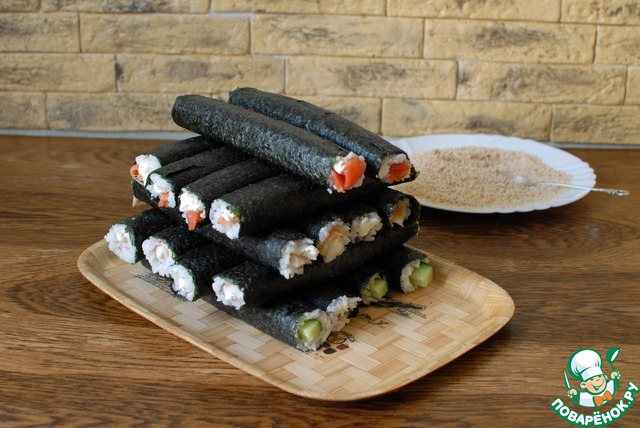 Я приготовила два коврика, хотела делать филадельфию (роллы рисом наружу), но времени было мало, поэтому все роллы сделала простые. -