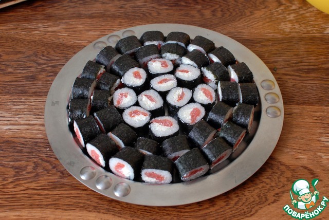 Это ролл с рыбой (часть с масляной, часть с красной) и сыром филадельфия. Таких я сделала побольше, мы их любим - 6 штук -