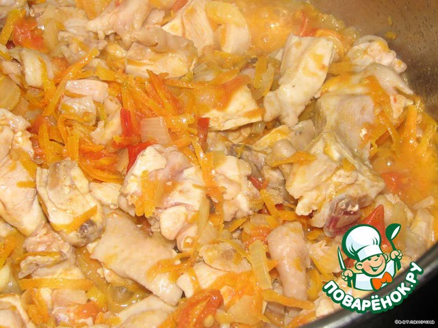 Курицу нарубаем на кусочки (по вкусу), добавляем к овощам и немножко обжариваем. Солим.