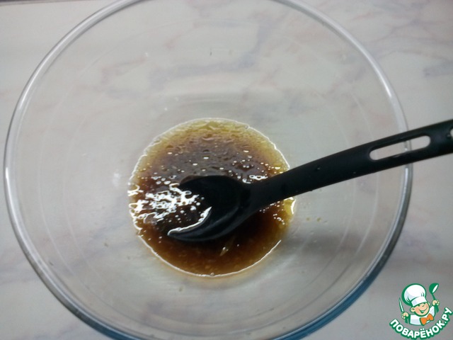 Приготовим соус: очищенный корень имбиря натрем на мелкой терке. Чеснок измельчим через чеснокодавилку. Из апельсина выжмем сок. Смешаем в большой миске имбирь, чеснок, сок апельсина, растительное масло и соевый соус.