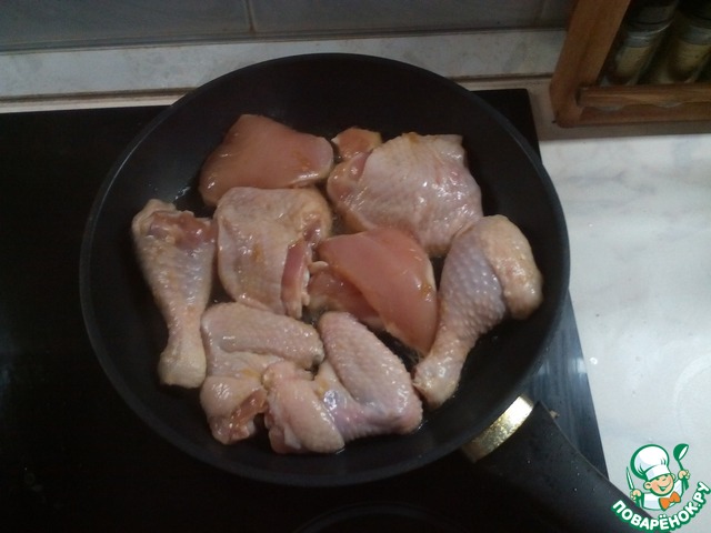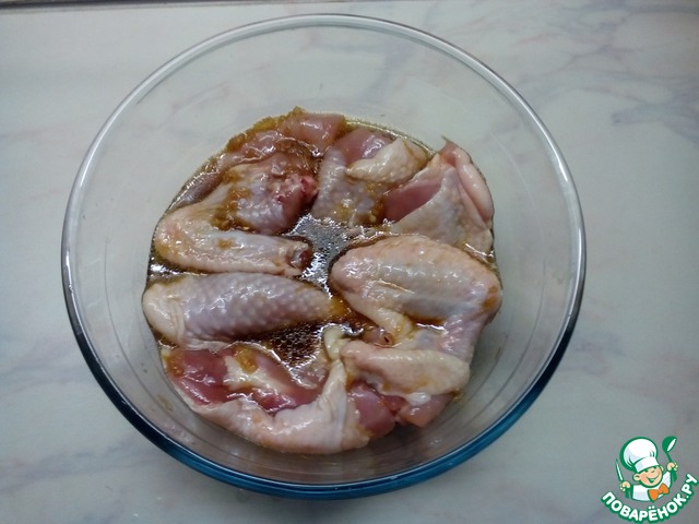 Курицу разделаем на кусочки. Я использовала все, кроме хребта, который пошел на суп. Замаринуем курицу в соусе в течение 30-60 минут.