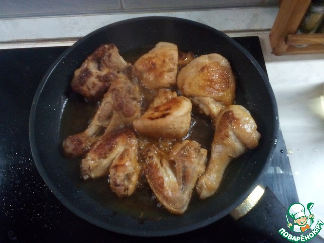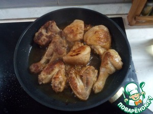 Курицу вынуть из соуса, обсушить на салфетках. Обжарить на растительном масле на сковородке в течение примерно 15 минут с двух сторон.