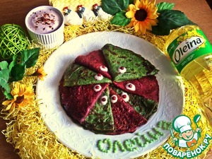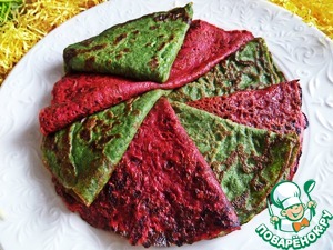Печём для разнообразия цветные блины. Используем любимые овощи. Для контраста я взяла шпинат и свёклу. Блины привлекают не только цветом, но и вкусом. Соус дополняет своей пикантностью!