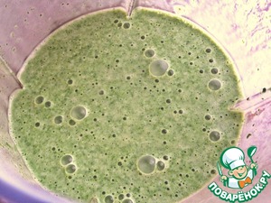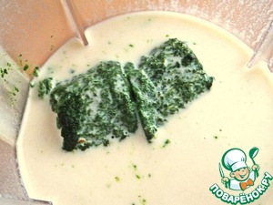 Размороженный шпинат бросить в кувшин-блендер. Взбить с основным тестом.