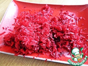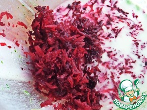 Налить снова в кувшин-блендер примерно треть теста и высыпать туда свёклу.