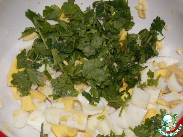 Добавить порезанную зелень, посолить и поперчить. Перемешать.