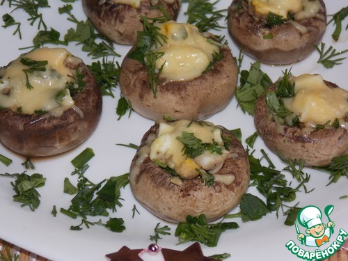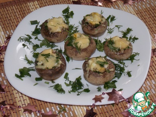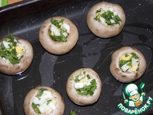 В смазанную маслом форму для запекания выложить грибы, немного посолить и поперчить. В каждый грибочек положить начинку.