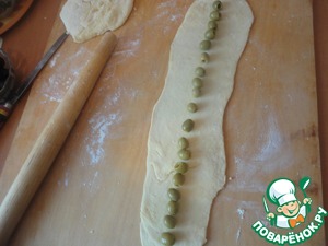 На третью полоску теста выложить маслины. Слепить по краям и свернуть вокруг пирога в виде спирали.