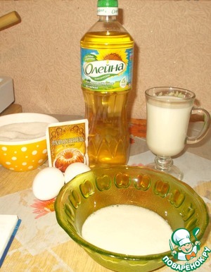Яйца взбиваем с сахаром и солью, добавляем растительное масло и тщательно перемешиваем. Добавляем молоко и еще раз хорошо мешаем. Затем добавляем разрыхлитель теста и муку, полученную массу взбиваем венчиком, до исчезновения комков.