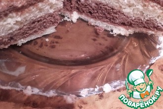 Хорошо остывший бисквит разрезать на три коржа и каждый корж пропитать вишневым сиропом.