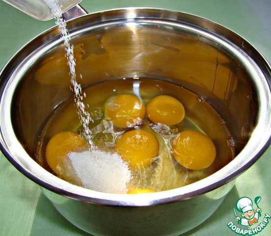 самое главное потом взбить яичную смесь в пышную светлую массу( она должна стать почти белой и плотной ), минут 10 на полной мощности миксера...