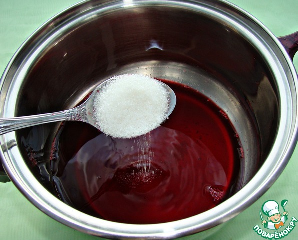 Затем вишню процедить, сок перелить в кастрюльку (если сока маловато, можно долить воды). Добавить в сок остальную часть сахара и уварить на медленном огне в течение 5 минут.