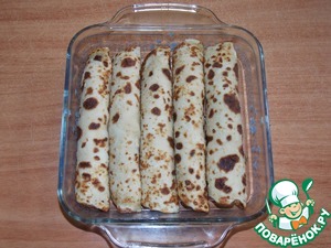 Уложить блины в форму, смазанную маслом, плотно друг к другу.