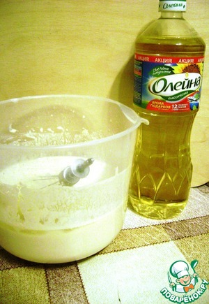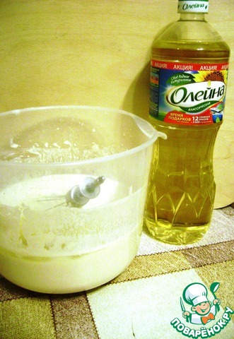 Простоквашу взбить с желтками и солью. Добавить просеянную муку и замесить гладкое тесто. Дать постоять полчаса. Затем добавить взбитые с сахаром в пену белки, газированную воду и масло «Олейна».