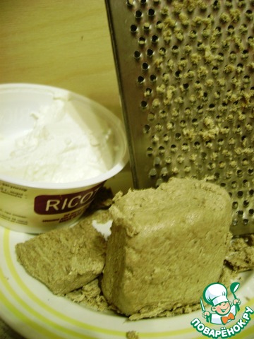 натереть халву на мелкой терке и, взбивая, смешать с рикоттой и сахаром, а лучше-пудрой.