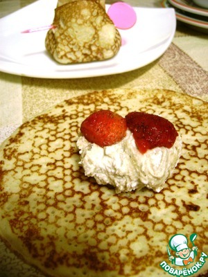 На блинчик выложить ложку начинки, сверху положить кусочек-два клубники и собрать края блинчика розочкой.