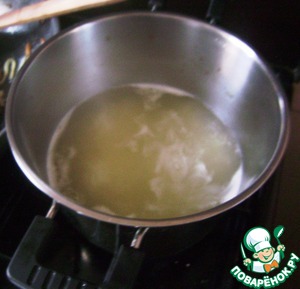 Грудку на кости с кожей залить соленым кипятком, чтобы только полностью покрыть ее. Довести до кипения и снять пену.